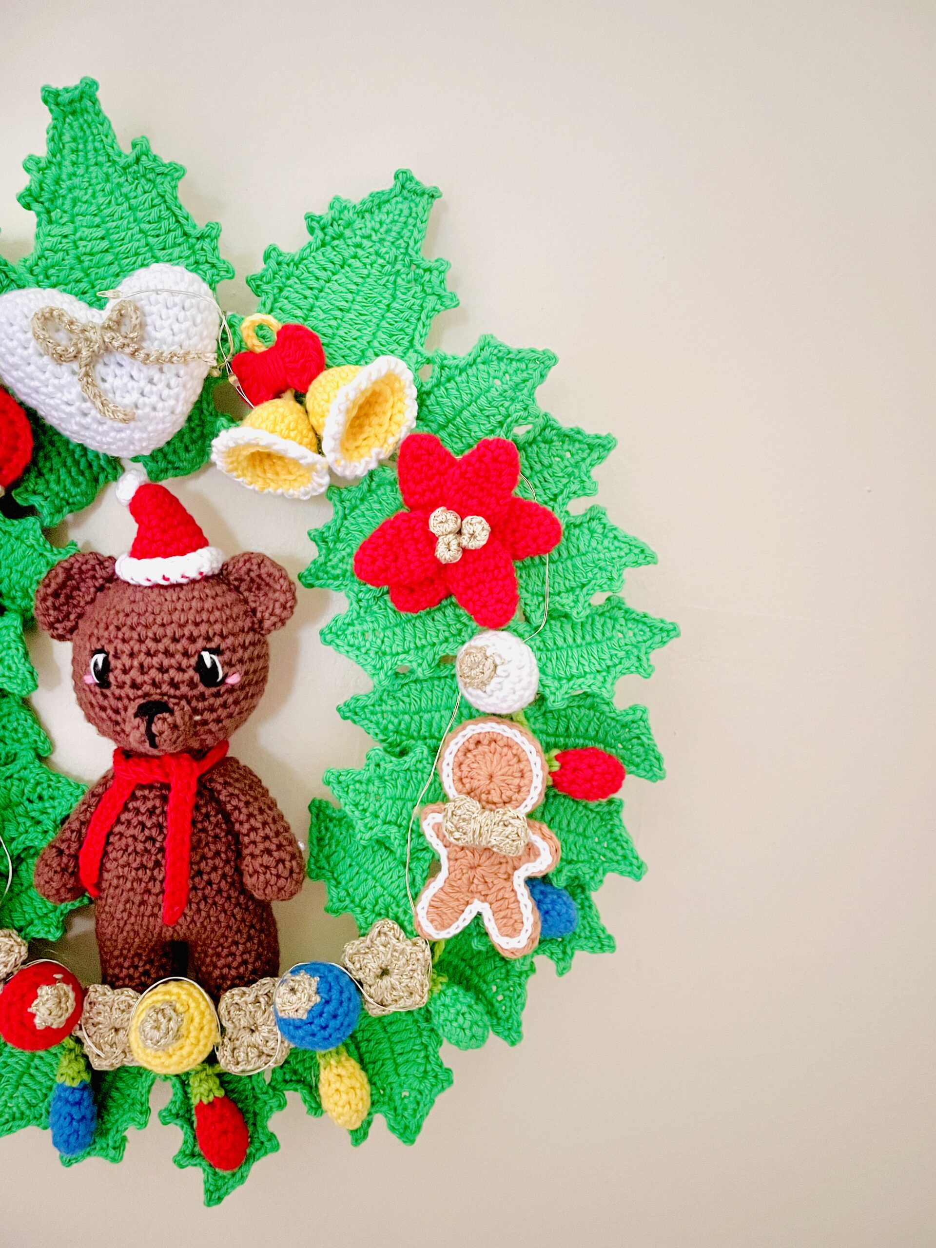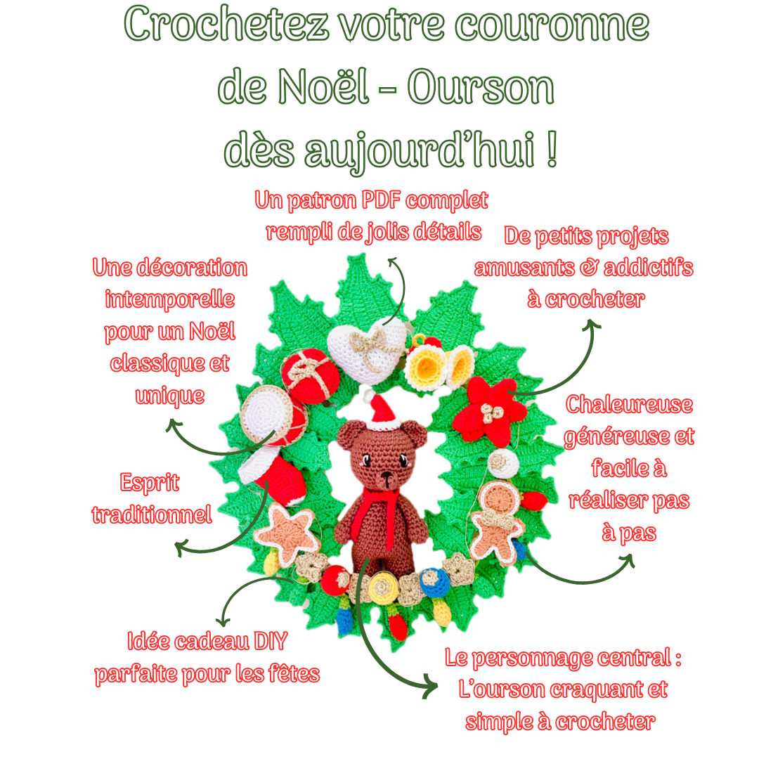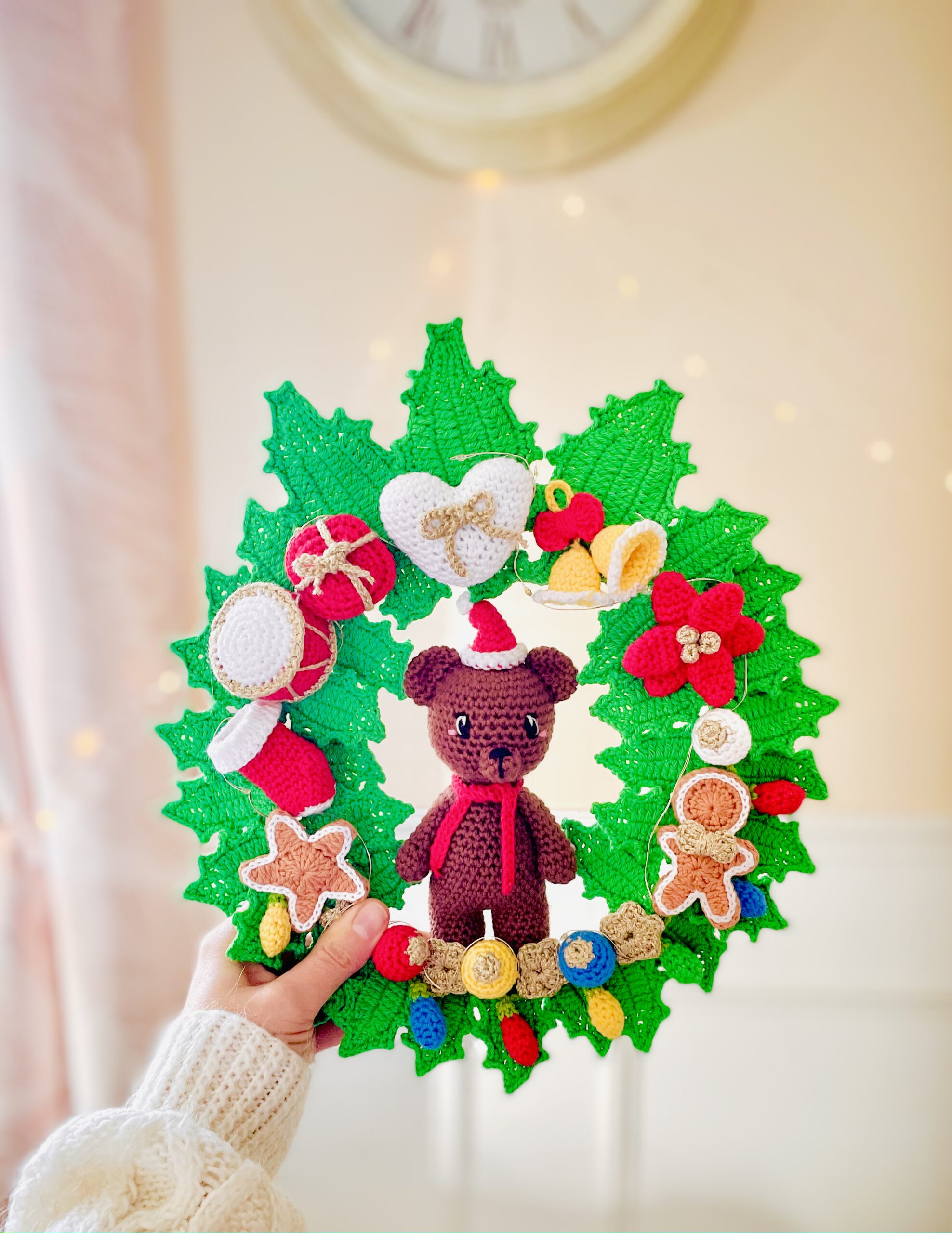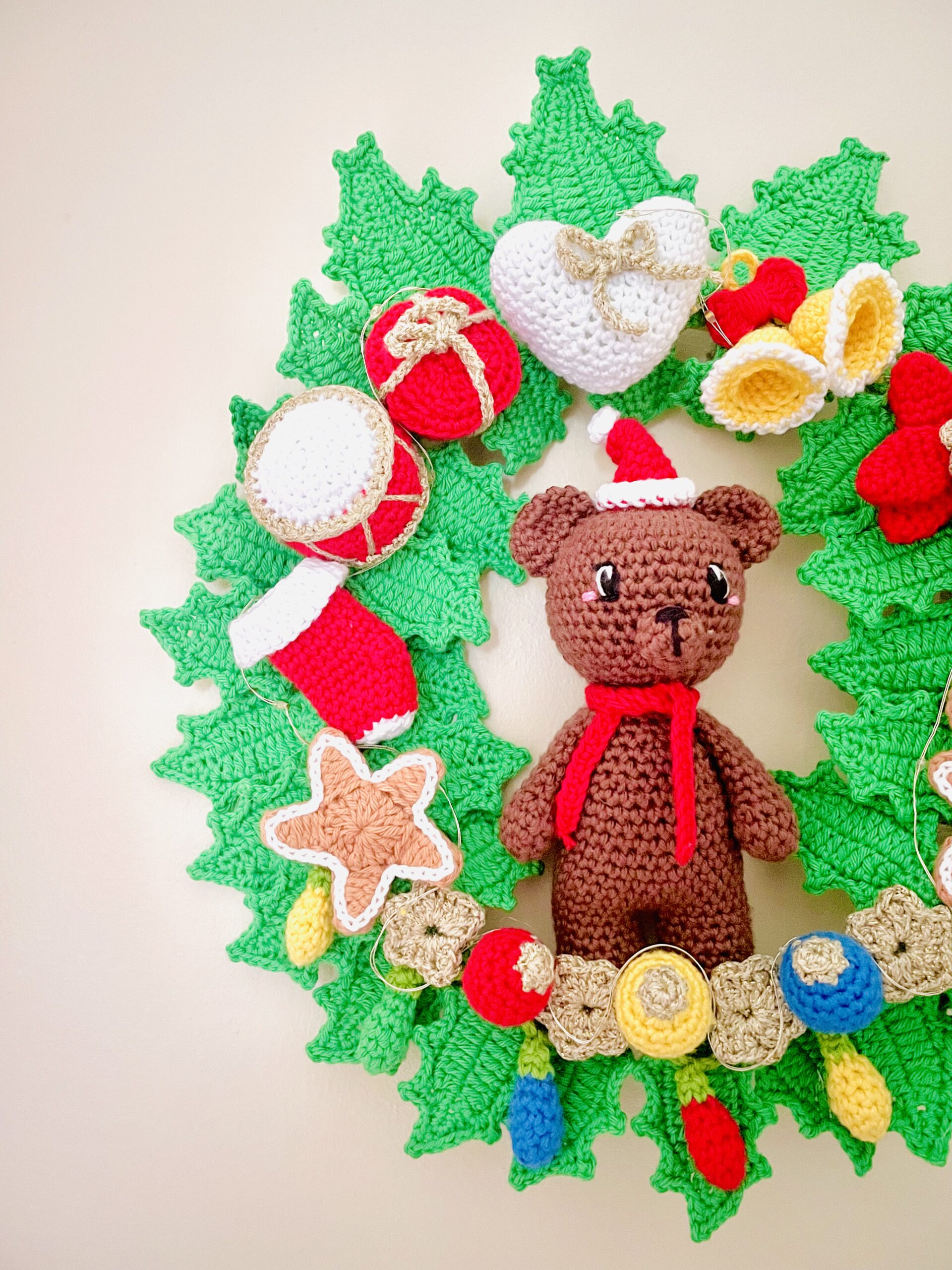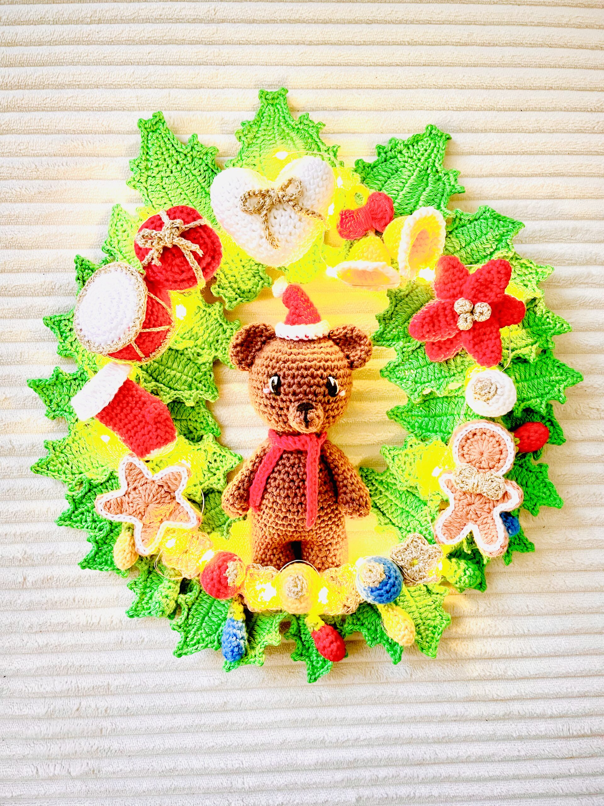 Découvrez un patron crochet PDF complet pour réaliser une couronne de Noël ourson au crochet, une décoration douce, chaleureuse et entièrement faite main. Ce modèle associe charme, poésie et esprit de fête pour embellir votre intérieur ou offrir un cadeau unique à l’un de vos proches.